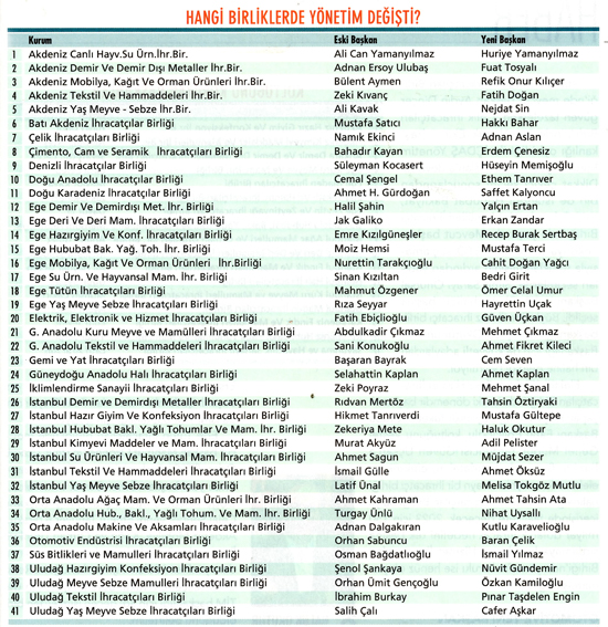Ege Tütün ihracatçıları Birliği'nde mevcut başkan Mahmut Özgener'in İzmir Ticaret Odası (İZTO) Başkanlığı'na seçilmesi sonrasında yeni başkan Ömer Cemal Umur oldu. Doğu Anadolu ihracatçılar Birliği başkanı Celal Şengör yerini Ethem Tanrıver'e bıraktı. Akdeniz Mobilya, Kağıt ve Orman Ürünleri ihracatçıları Birliği'nde ise ihracat dünyasının deneyimli ismi Bülent Aymen koltuğunu Refik Onur Kılıçer'e bıraktı. Bülent Aymen'in de TİM başkanlığı için adı geçen isimlerden biri olduğunu belirtelim.
