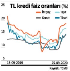 Dünya'nın haberine göre, kredi faizlerinde yükseliş sürerken kredi talebinde de ivme kaybı sürüyor. İhtiyaç kredi faizleri 24 Nisan 2020’de gördüğü yüzde 8,24 seviyesinden yükseldi ve 7 Ağustos haftasında yüzde 13 seviyelerine tırmandı. Ardından atılan adımlarla beraber son haftalarda yüzde 20 sınırına doğru ilerleyen faiz oranı 25 Eylül’de yüzde 18,92’ye çıktı. İhtiyaç kredi faizleri haftalık artış 28 baz puan oldu.