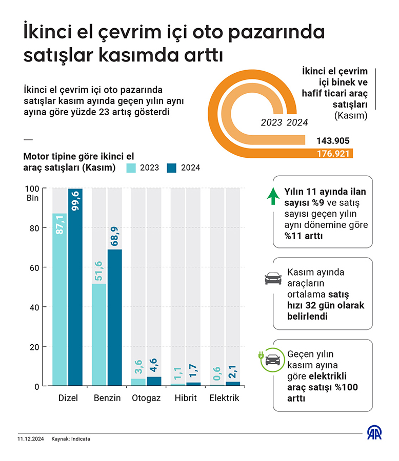 Dizel otomobilleri 68 bin 952 satışla benzinli, 4 bin 552 ile oto gazlı otomobiller takip etti. Hibrit otomobil satış sayısı 1674, elektrikli otomobil satışları ise 2 bin 103 oldu. Kasım 2023'te 551 ikinci el elektrikli otomobil satılmıştı.