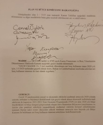 Meclis Plan Bütçe Komisyonu'nda görüşülen 4749 sayılı Kamu Finansmanı ve Borç Yönetimi'nin Düzenlenmesi Hakkındaki Kanuna eklenecek geçici madde teklifi AK Partili vekillerin verdiği önergeyle komisyona sunuldu. Cumhurbaşkanı tarafından uygulanacak kanun uyarınca hükümet 2020 yılında borçlanma miktarını iki katına çıkarabilecek.