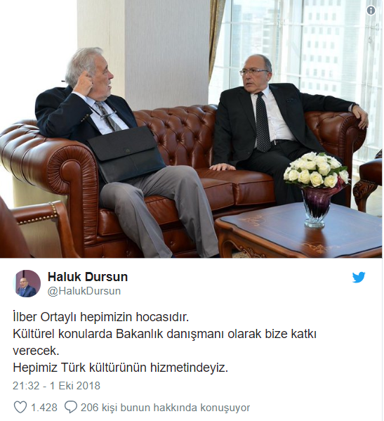 Twitter'dan açıklama yapan Dursun, "İlber Ortaylı hepimizin hocasıdır. Kültürel konularda Bakanlık danışmanı olarak bize katkı verecek. Hepimiz Türk kültürünün hizmetindeyiz" dedi.