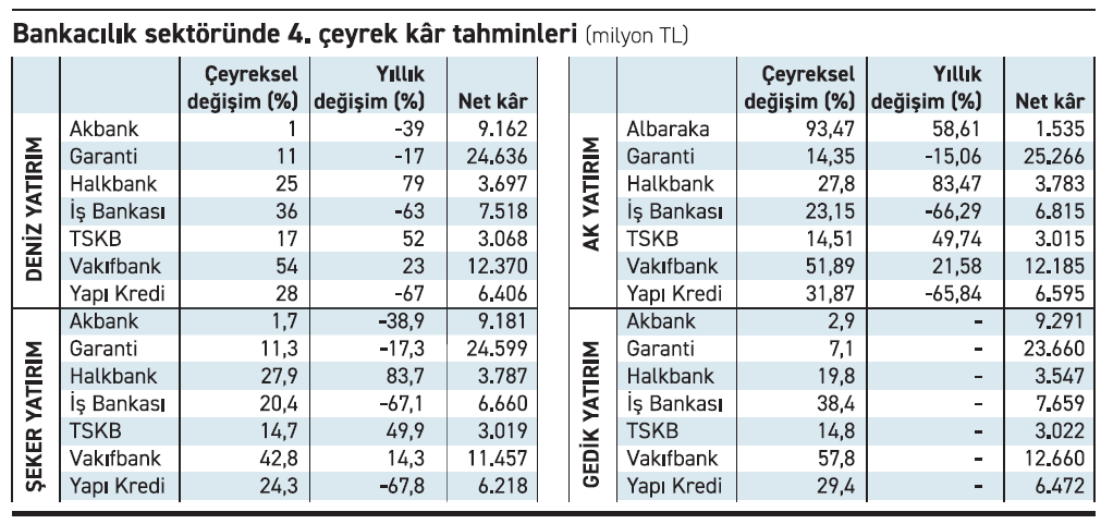 Ak Yatırım raporunda üçüncü çeyreğe çeyreğe kıyasla dördüncü çeyrekte araştırma kapsamındaki bankalarda ortalama yüzde 26 kâr artışı bekliyor. Kredi-mevduat makasında ılımlı iyileşme ve gayrimenkul iştirak değerlemesinin bankaların dördüncü çeyrek kazançlarını iyileştirdiğini belirten Ak Yatırım son çeyrekte TL fonlama ve kredi faizlerinin neredeyse yatay seyrettiğini vurguladı.