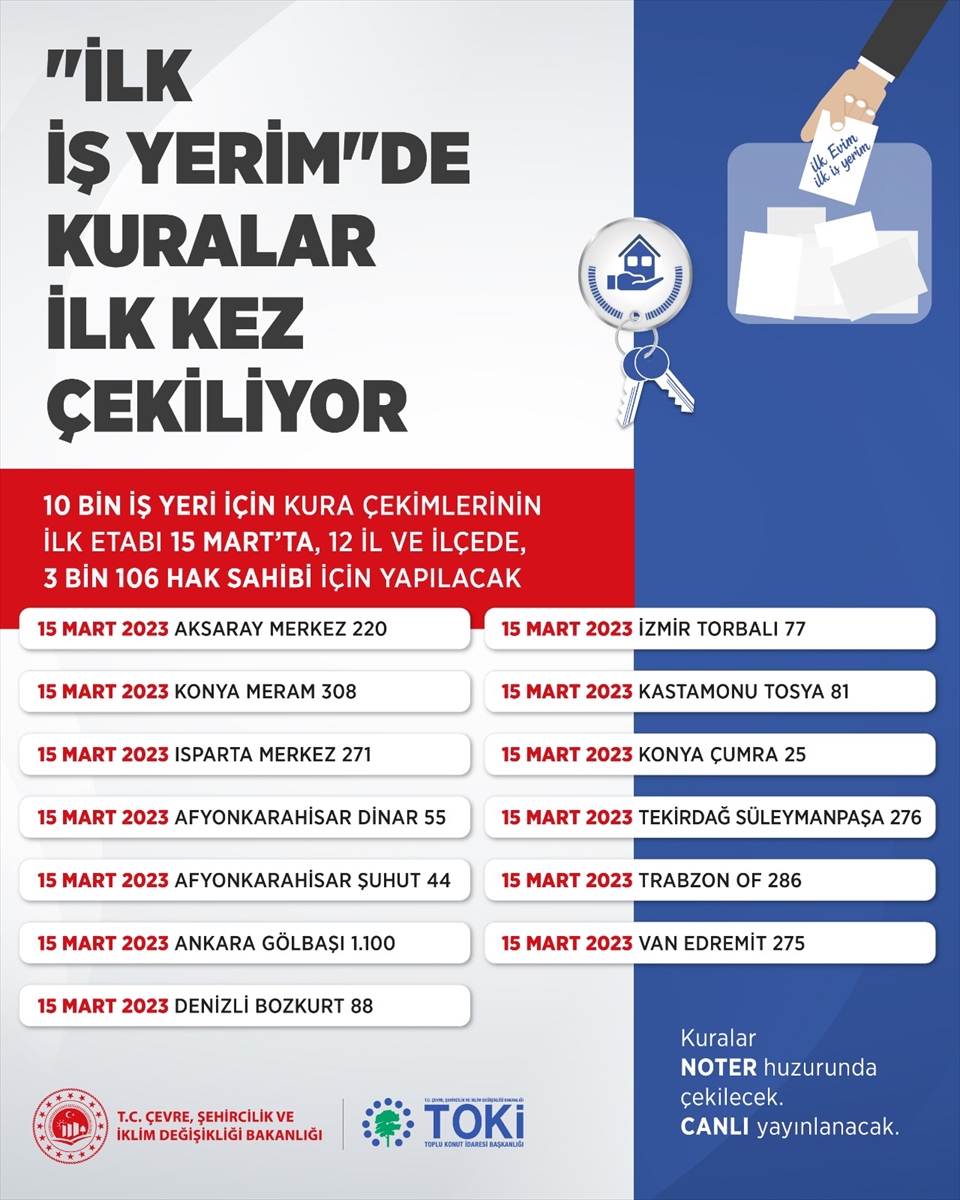 Cumhurbaşkanı Recep Tayyip Erdoğan’ın 13 Eylül 2022 tarihinde açıkladığı ve ilk kuraları 7 Kasım 2022 tarihinde Ardahan ve Şırnak illeriyle başlayan “İlk Evim, İlk İş Yerim” projesinde noter huzurunda gerçekleştirilen kura çekimleri 6 Şubat’ta Kahramanmaraş’ta meydana gelen depremler nedeniyle ertelenmişti. Ara verilen kura çekimlerine 6 Mart itibarıyla Ankara ile tekrar başlandı.