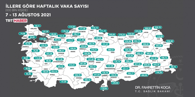 İllere göre haftalık COVID-19 vaka sayısı, her 100 bin kişide İstanbul'da 181,96, Ankara'da 199,55, İzmir'de 49,81 oldu.