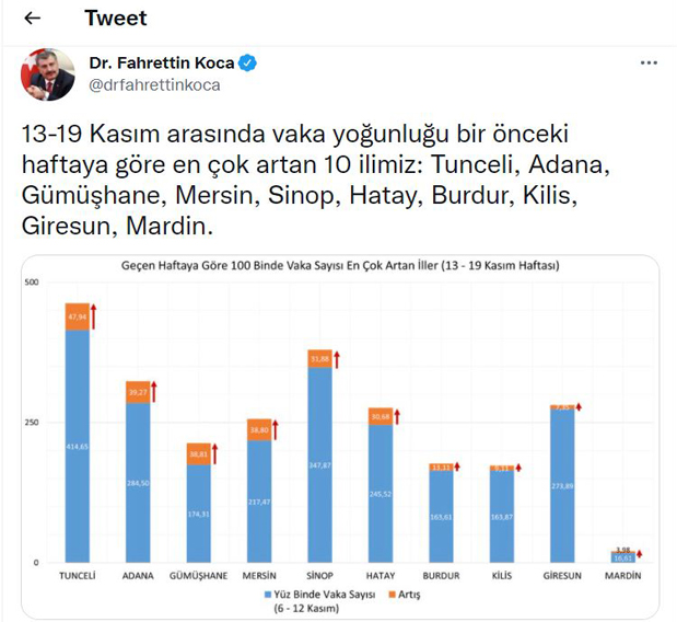 Verilere göre, vaka sayısı her 100 bin kişide İstanbul'da 277,88, Ankara'da 197,20, İzmir'de 70,02 oldu. Vaka yoğunluğu en çok artan 10 il ise; Tunceli, Adana, Gümüşhane, Mersin, Sinop, Hatay, Burdur, Kilis, Giresun ve Mardin.
