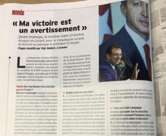 İstanbul Büyükşehir Belediye Başkanı Ekrem İmamoğlu dünyaca ünlü Fransız dergisi L’Ekspress’e röportaj verdi. “Yeni İBB Başkanı Ekrem İmamoğlu, megapol İstanbul için projelerini anlatırken Cumhurbaşkanı Erdoğan’ı iğneliyor” diyen dergi, “Benim zaferim bir uyarıdır” başlığını attı.