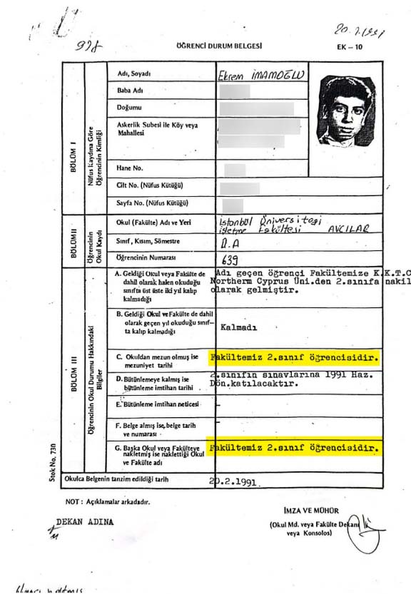 Ekrem İmamoğlu hakkında, üniversite diplomasının sahte olduğu iddiasıyla "resmi belgede sahtecilik" suçundan açılan soruşturma kapsamında Yükseköğretim Kurulunca (YÖK) hazırlanan raporda, İstanbul Üniversitesi İşletme Fakültesi Dekanlığı tarafından tanınırlık, yatay geçiş, yatay geçiş kontenjanları, ilan süreleri ve yatay geçiş kabulüne dair işlemlerin Yükseköğretim Kurulu kararlarına ve usulüne uygun yürütülmediği belirtilmişti.