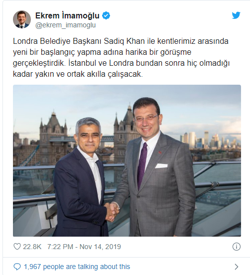 İngiltere’nin başkenti Londra’da temaslarda bulunan İstanbul Belediye Başkanı Ekrem İmamoğlu, Londra Belediye Başkanı Sadık Han ile bir araya geldi. İmamoğlu, burada Reuters'a verdiği mülakatta "Türkiye ile ilgili olumsuz manşetlere ilişkin endişeler ve tahmini ekonomik sıkıntılar geçici" dedi.