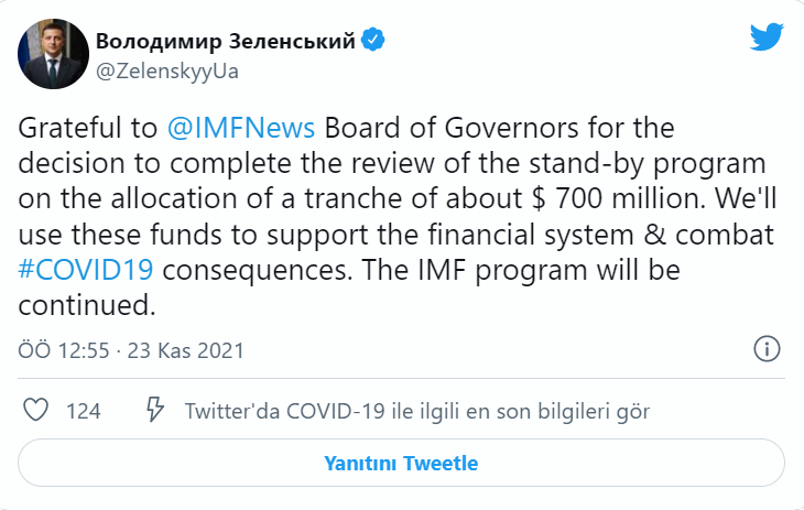 Twitter’dan açıklama yapan Zelenskiy, IMF Yönetim Kurulu’na 'stand-by' programının yeniden değerlendirilmesini tamamlamaya yönelik verilen olumlu karar nedeniyle teşekkür etti. Ukrayna IMF’den 700 milyon dolar alacak.