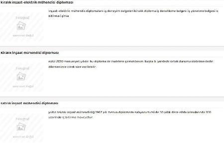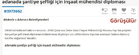 İlanlarda, "Yap-sat projeleri için şantiye şefi göstermek adına anlaşıldığı takdirde diplomamı kullandırabilirim", "7 yıllık inşaat mühendisi diplomam şantiye şefliği, yapı denetim firmaları veya ihaleler için kiralıktır", "Yıldız teknik inşaat mühendisliği 1967 yılı mezunu diplomamı satıyorum", "DSİ'de 30 yıllık dere ıslahı konularında 100 üzerinde iş bitirme mevcuttur" gibi benzer başlıklarda çok sayıda ilan bulunuyor.