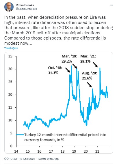 Brooks ayrıca TL'de 2018 ve sonrasında baskıyı azaltmak adına kullanılan "faiz baskısında" marjın azaldığına da değindi.