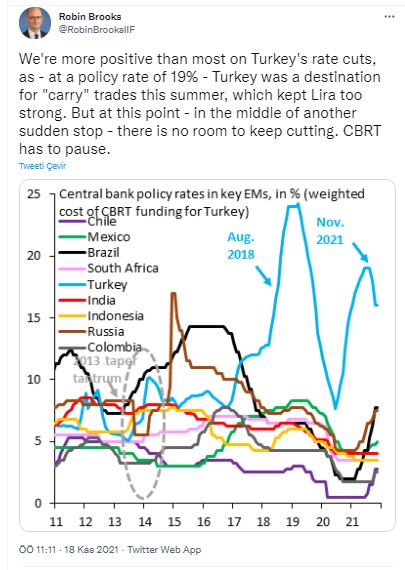Twitter üzerinde açıklama yapan Brooks, "Politika faizi yüzde 19 olduğundan Türkiye'nin faiz indirimleri konusunda pek çok kişiden daha pozitiftik. Ancak gelinen bu noktada -bir başka ani duruşun ortasında- faiz indirimine devam etmek için alan yok. TCMB ara vermeli" dedi.