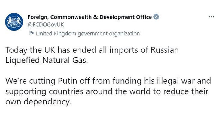 Dışişleri, İngiliz Milletler Topluluğu ve Kalkınma Ofisi (FCDO), Rusya’dan sıvılaştırılmış doğal gaz ithalatının durdurulduğunu açıkladı.