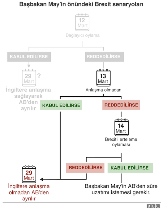 Diğer AB üyesi devletlerin de hem fikir olması durumunda Brexit ertelenebilir. Theresa May, böyle bir durumda Brexit'in 3 aydan fazla ertelenmemesi gerektiğini söylüyor.