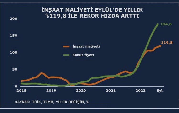 İnşaat maliyet endeksi, 2022 yılı Eylül ayında bir önceki aya göre yüzde 1,57, bir önceki yılın aynı ayına göre yüzde 119,83 arttı.