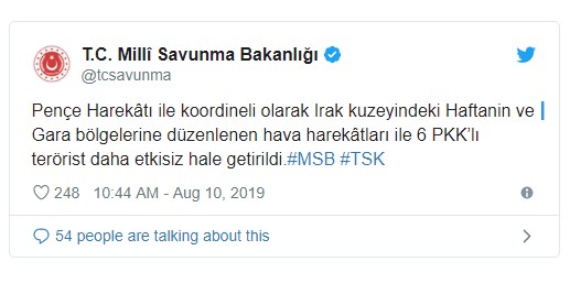 Milli Savunma Bakanlığından yapılan açıklamada, Pençe Harekatı ile koordineli olarak Irak'ın kuzeyindeki Haftanin ve Gara bölgelerine hava harekatı düzenlendiği kaydedildi.