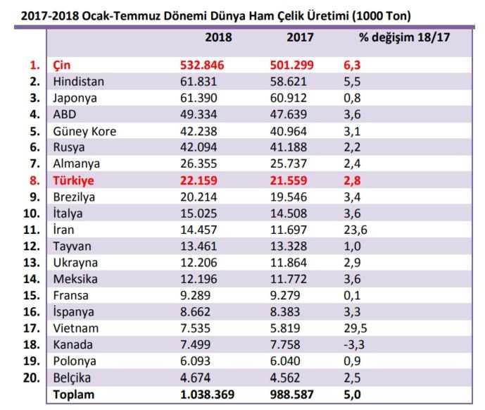 Dünya Çelik Derneği’nin (worldsteel) açıkladığı verilere göre, Ocak-Temmuz döneminde dünya ham çelik üretimi, geçtiğimiz yılın aynı dönemine kıyasla % 5 seviyesinde artışla 1.04 milyar tona ulaştı.