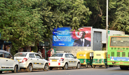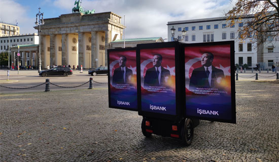 Banka tarafından Londra, Berlin, Bükreş, Delhi, Milano gibi şehirlerde yürütülen çalışmalarında; şehir meydanlarına İş Bankası imzasıyla “Mustafa Kemal Atatürk 29 Ekim 1923’te dünyaya Cumhuriyetimizi ilan etti. Biz de aynı heyecan ve coşkuyla Cumhuriyetimizin 100. yaşını tüm dünyaya ilan ediyoruz.” yazıldı.