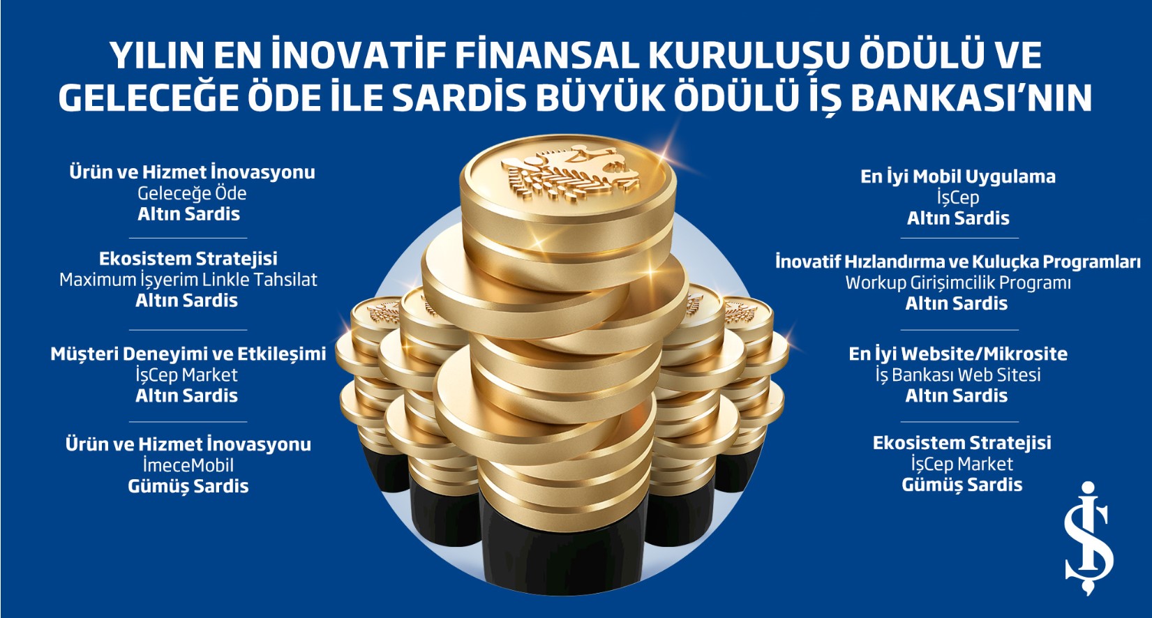 Banka, organizasyonun en büyük iki ödülünün yanı sıra pek çok farklı kategoride de altın ödüle layık görüldü. Geleceğe Öde, Ürün ve Hizmet İnovasyonu kategorisinde; İşCep, Market Müşteri Deneyimi ve Etkileşimi kategorisinde; Maximum İşyerim – Linkle Tahsilat, Ekosistem Stratejisi kategorisinde; Workup Girişimcilik Programı, İnovatif Hızlandırma ve Kuluçka Programları kategorisinde; İş Bankası web sitesi ve İşCep, Dijital Pazarlama kategorisinde Sardis Jüri üyeleri tarafından Altın Ödüller ile takdir edildi. İş Bankası ayrıca Ürün ve Hizmet İnovasyonu kategorisinde İmeceMobil ve Ekosistem Stratejisi kategorisinde İşCep Market ile Gümüş Ödül aldı.