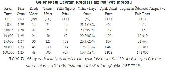 Kampanya kapsamında vade 3-48 ay arasında belirlenebilmektedir. Aylık taksit tutarları, geri ödemeler 30 gün sonra başlayacak şekilde hesaplanmıştır. Kefil ön şartı aranmamakla birlikte, şubelerimiz gerekli gördükleri takdirde kefil talep edebilecektir. Tahsis ücreti ve sigorta primi tabloda belirtilen kredi dilimleri için örnek olarak hesaplanmıştır. Tahsis ücreti kredi tutarına göre değişkenlik gösterecektir. Söz konusu ücrete %5 oranındaki BSMV dahil değildir. Sigorta primi ise 35 yaş üzerinden hesaplanmış olup; kredi tutarı, kredi vadesi ve müşterinin yaşına göre değişkenlik gösterecektir. Hesaplanan yıllık maliyet oranına sigorta tutarı dahil edilmemiştir. Banka, kampanya süresince kampanya koşullarını değiştirme hakkını saklı tutar.
