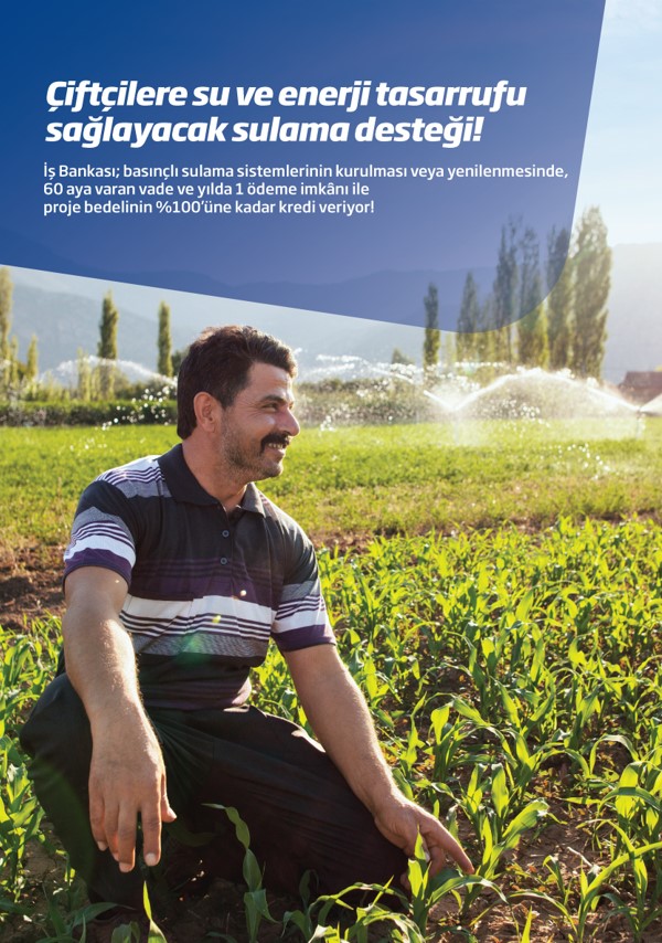 Türkiye İş Bankası, Basınçlı Sulama Sanayicileri Derneği (BASUSAD) ile gerçekleştirdiği iş birliği ile basınçlı sulama sistemleri konusunda çiftçilere destek sunuyor. Banka, bu çerçevede basınçlı sulama sistemlerinin kurulması ve yenilenmesinin finansmanı amacıyla 60 aya kadar vade, yılda 1 defa ödemeli olarak proje bedelinin %100’üne kadar kredi imkânı sunuyor. Kredi başvuruları, BASUSAD üyesi üretici/satıcı firmaların yanı sıra isbank.com.tr’den veya İş Bankası Şubelerinden alınabiliyor.