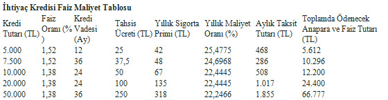 Azami kredi tutarı 50.000 TL, azami vade 36 aydır. Aylık taksit tutarları, geri ödemeler 30 gün sonra başlayacak şekilde hesaplanmıştır. Kefil ön şartı aranmamakla birlikte, şubelerimiz gerekli gördükleri takdirde kefil talep edebilecektir. Tahsis ücreti ve sigorta primi tabloda belirtilen kredi dilimleri için örnek olarak hesaplanmıştır. Tahsis ücreti kredi tutarına göre değişkenlik gösterecektir. Söz konusu ücrete %5 oranındaki BSMV dâhil değildir. Sigorta primi ise 35 yaş üzerinden hesaplanmış olup; kredi tutarı, kredi vadesi ve müşterinin yaşına göre değişkenlik gösterecektir. Hesaplanan yıllık maliyet oranına sigorta tutarı dâhil edilmemiştir. Banka, kampanya süresince kampanya koşullarını değiştirme hakkını saklı tutar.
