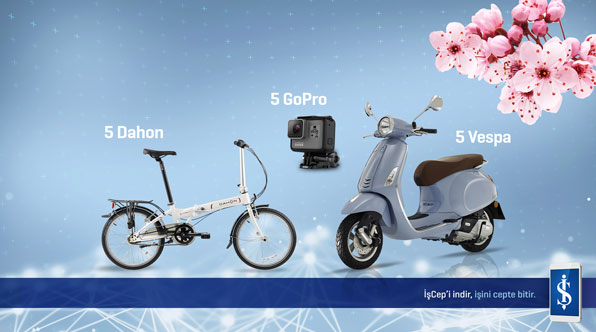 İşCep müşterilerine için gerçekleştirilen ve 5 Mayıs’a kadar devam edecek çekiliş kampanyası ile 5 adet Vespa Primavera motosiklet, 5 adet Dahon katlanır bisiklet ve 5 adet GoPro Hero 5 Black aksiyon kamerası hediye edilecek.