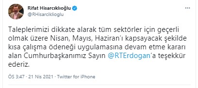 Türkiye Odalar ve Borsalar Birliği Başkanı Rıfat Hisarcıklıoğlu, sosyal medya hesabından yapttığı açıklamada, Cumhurbaşkanı Erdoğan'a teşekkür etti. Hisarcıklıoğlu, "Taleplerimizi dikkate alarak tüm sektörler için geçerli olmak üzere Nisan, Mayıs, Haziran’ı kapsayacak şekilde kısa çalışma ödeneği uygulamasına devam etme kararı alan Cumhurbaşkanımız Sayın Recep Tayyip Erdoğan'a teşekkür ederiz" açıklamasını yaptı.