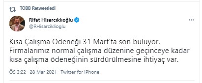 Türkiye Odalar ve Borsalar Birliği (TOBB) Başkanı Rifat Hisarcıklıoğlu, sosyal medya hesabı üzerinden yaptığı açıklamada, kısa çalışma ödeneği desteğinin 31 Mart’ta son bulduğunu hatırlatarak, firmaların normal çalışma düzenine geçene kadar, bu desteğin sürdürülmesine ihtiyaç olduğunu söyledi.