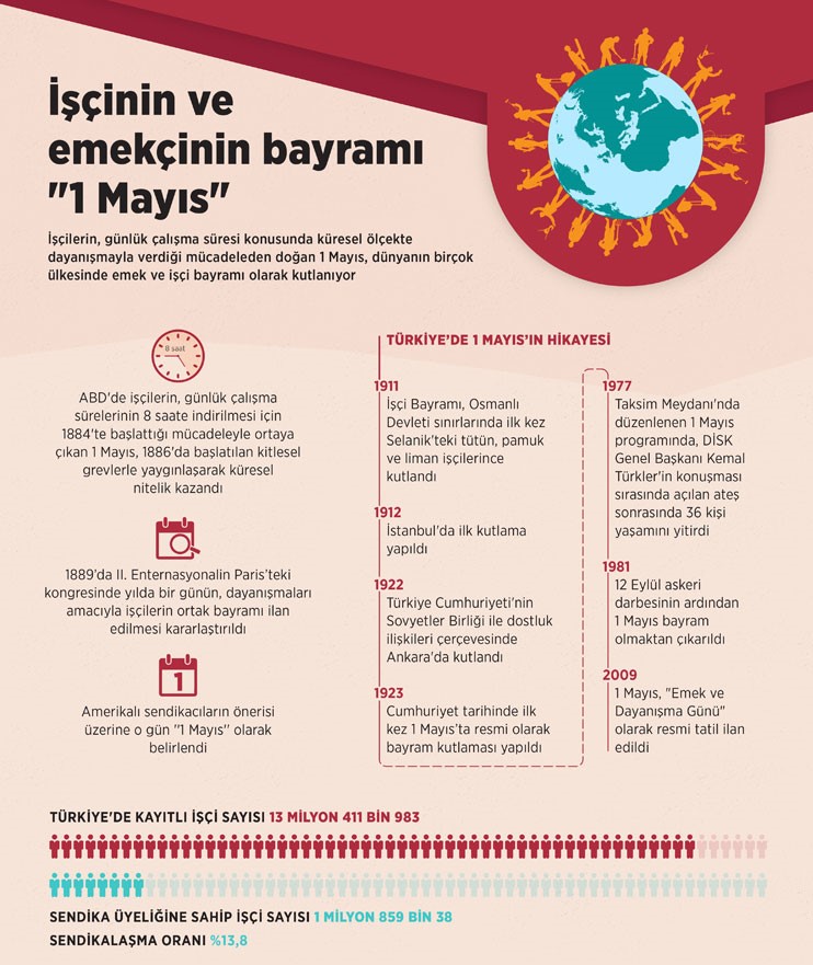 İşçilerin, günlük çalışma süresi konusunda küresel ölçekte dayanışmayla verdiği mücadeleden doğan 1 Mayıs, dünyanın birçok ülkesinde emek ve işçi bayramı olarak kutlanıyor.