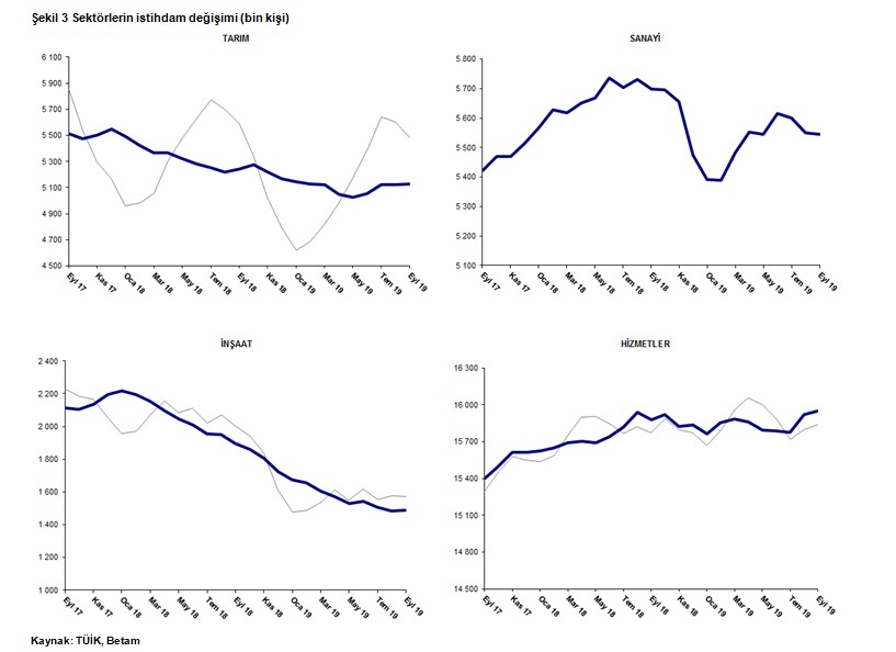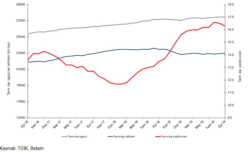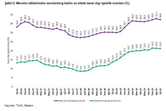 Mevsim etkilerinden arındırılmış işgücü verilerine göre tarım dışı işsizlik oranı Eylül 2019 döneminde Ağustos dönemine kıyasla 0,2 puan azalarak yüzde 16,3 olarak gerçekleşmiştir. Bu dönemde tarım dışı istihdam 29 bin kişi artarken, tarım dışı işgücü 31 bin kişi azalmıştır. Sektörel verilere göre sanayi sektörü dışındaki tüm sektörlerde istihdam artışı yaşanmış, en yüksek artış ise 31 bin ile hizmetler sektöründe gözlemlenmiştir. Tarım sektöründe 7 bin, inşaat sektöründe ise 2 binlik istihdam artışı kaydedilmiştir. Sanayide ise istihdam kaybı 5 bin olarak gerçekleşmiştir. Mevsim etkilerinden arındırılmış verilere göre erkek istihdamı 12 dönemin ardından ilk kez artarken (28 bin) iken kadın istihdamı Eylül 2019 döneminde 7 binlik azalış kaydetmiştir.
