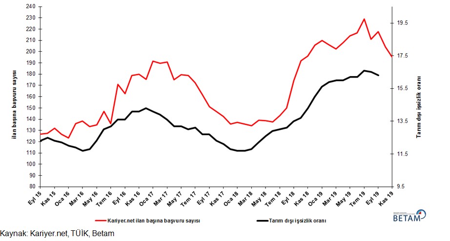 Betam tahmin modeli, mevsim etkilerinden arındırılmış tarım dışı işsizliğin Eylül 2019 döneminde yüzde 16,8 olarak gerçekleşeceğini tahmin etmişti. Ağustos 2019’daki tarım dışı işsizlik oranının revize edilmesinin ardından,bu oran Eylül 2019 döneminde yüzde 16,3 olarak gerçekleşti. Betam tahmin modeli Ekim 2019 döneminde mevsim etkilerinden arındırılmış tarım dışı işsizlik oranının 0,3 yüzde puan azalarak yüzde 16,0 seviyesine gerileyeceğini öngörmektedir.Tahmin modelinin ayrıntılarına Betam internet sitesinden ulaşılabilir.[1] Tahmin modelinde kullanılan Kariyer.net[2] verilerinden ilan başına başvuru sayısı Şekil 2'de gösterilmektedir. Kariyer.net'in verileri Betam tahmin modelinin girdilerinden biri olmakla birlikte tek etken değildir. Tahminde kullanılan ekonometrik modelde İŞKUR verileri, reel kesim güven endeksi, kapasite kullanım oranı gibi farklı birçok değişken kullanılmaktadır.