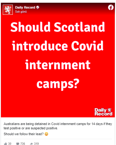 Daily Record gazetesi, takipçilerine sosyal medya sitesi Facebook üzerinden korona virüsle ilgili bir soru sordu. Gazete yayınladığı postta, “Avustralyalılar, pozitif test edilirlerse veya pozitif olduklarından şüphelenilirse 14 gün boyunca koronavirüs toplama kamplarında tutuluyorlar. Onların liderliğini takip etmeli miyiz?" dedi. Ancak şüpheli gözaltıların nasıl önlenebileceği, örneğin burnunu çektiği tespit edilenlerin veya Kovid-19'a karşı aşı olmayı reddeden vatandaşların kilit altına alınması anlamına gelip gelmeyeceği konusunda herhangi bir öneris sunulmadı.