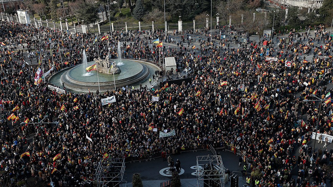Madrid'in merkezindeki Cibeles Meydanı'nı dolduran binlerce kişi, mecliste ayrılıkçı Katalan ve Bask siyasi partilerin dışarıdan desteğiyle azınlıkta iktidarda olan sol koalisyon hükümetin politikalarını eleştirerek "(Başbakan Pedro) Sanchez istifa" sloganları attı.