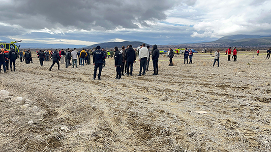 Düşen helikopterin ikiye bölündüğü, parçalarının 50 metre arayla savrulduğu belirlendi. Helikopterin kırıma uğradığı alan güvenlik şeridiyle çevrelenirken, güvenlik güçleri arazide arama tarama faaliyeti yürütüyor. Diğer helikopterin ise kaza yerinin 400 metre ilerisine güvenli iniş yaptığı görüldü. Güvenlik güçleri, helikopterin çevresinde nöbet tutuyor.