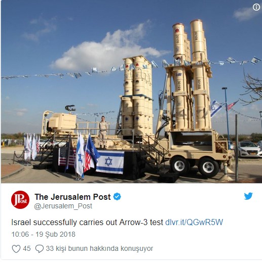 İsrail Savunma Bakanlığı, ABD Füze Savunma Ajansı ile birlikte dün gece 'Arrow-3' adlı füze savunma sistemini başarıyla test ettiğini duyurdu.
