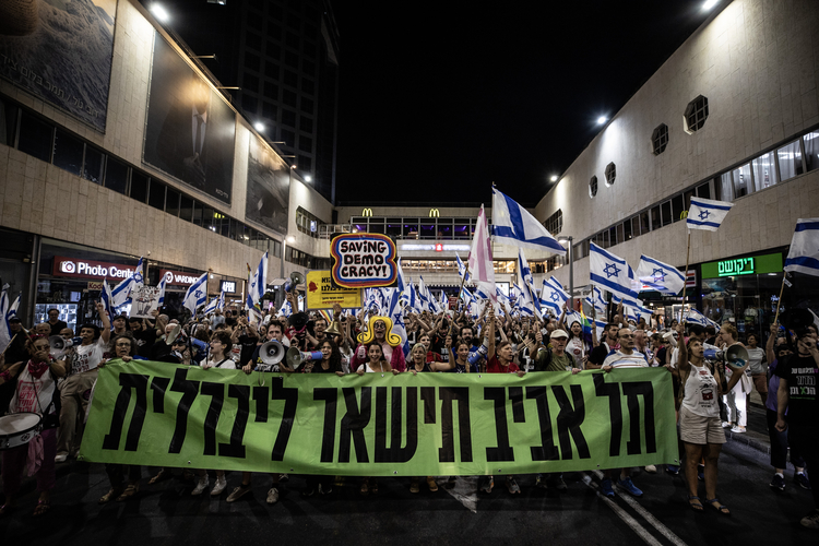 İsrail bayrakları taşıyan protestocular, davullar, düdükler ve havalı kornalarla ritim tutarak "demokrasi" sloganları attı.
