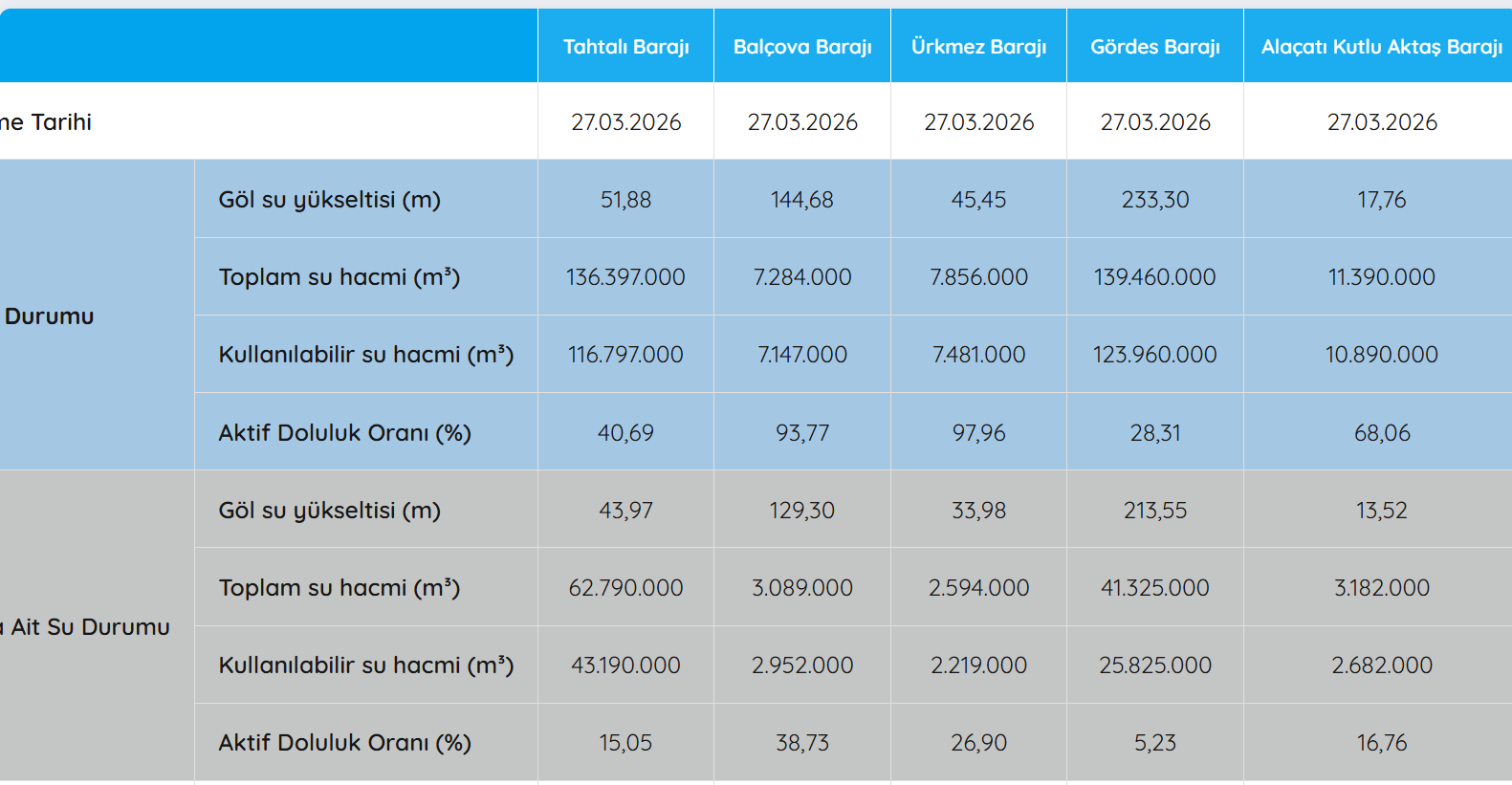 İZSU'nun resmi internet sitesindeki bilgilere göre İzmir'in içme suyu ihtiyacını karşılayan barajlarda doluluk oranları hızla artıyor.