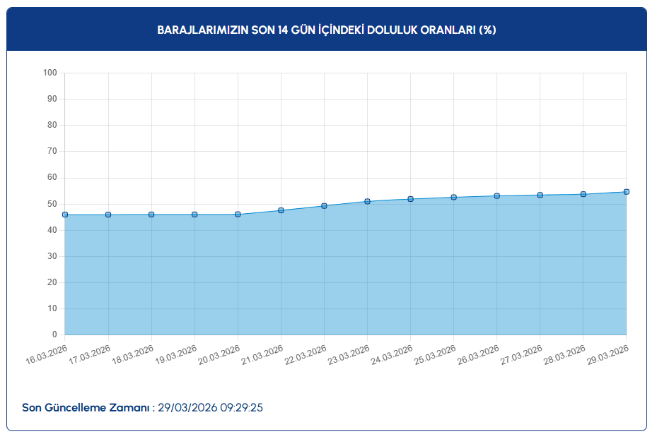 Geçtiğimiz haftalarda yüzde 45-50 bandında seyreden doluluk oranları, son 14 günlük periyotta yaşanan yağış dalgasıyla birlikte yaklaşık yüzde 6'lık bir artış gösterdi.