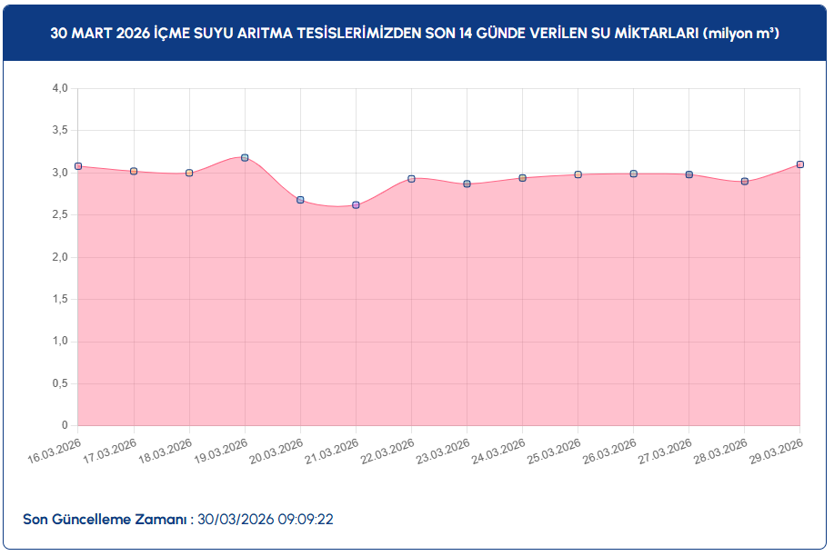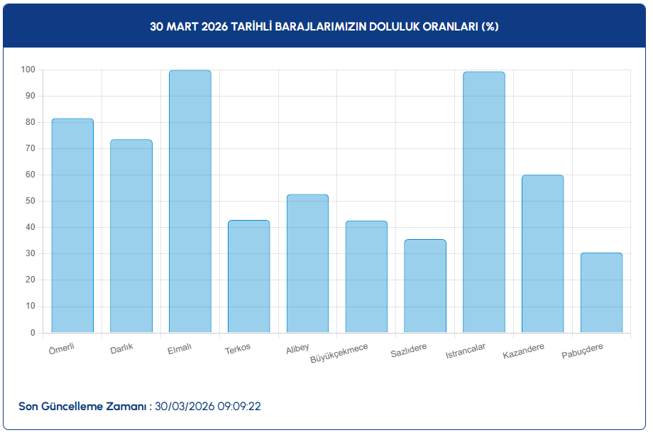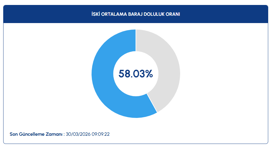 Ramazan bayramında doluluk oranları yüzde 50'yi aşan İstanbul içme suyu barajlarında doluluk oranı yüzde 60'a yaklaştı. İstanbul Su ve Kanalizasyon İdaresi (İSKİ) tarafından paylaşılan 30 Mart 2026 tarihli (bugün) verilere göre, İstanbul’a su sağlayan barajlardaki ortalama doluluk oranı yüzde 58,03 olarak ölçüldü.