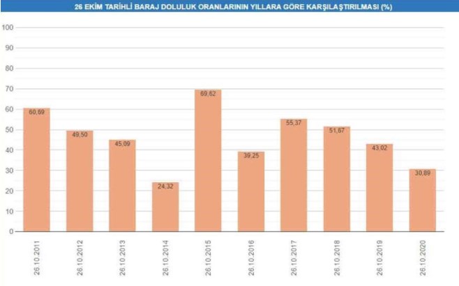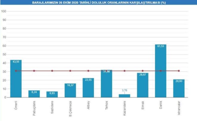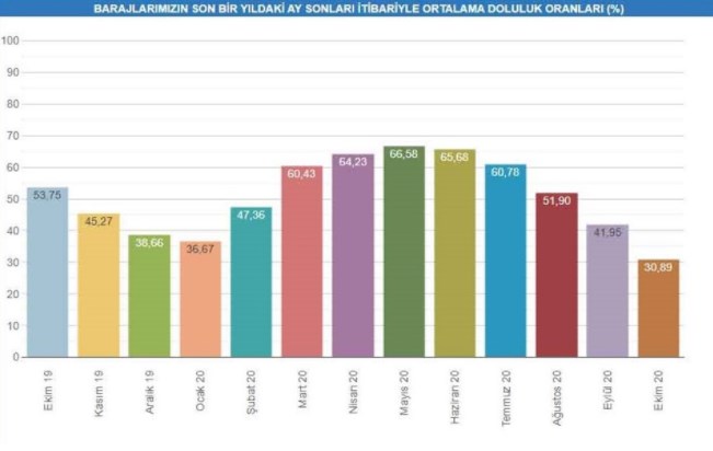 İstanbul Su ve Kanalizasyon İdaresi (İSKİ) verilerine göre; mayıs ayında yüzde 66 ile yılın en yüksek seviyesine çıkan doluluk oranı kademeli bir şekilde düşerek ekimde yüzde 30'lara kadar geriledi.
