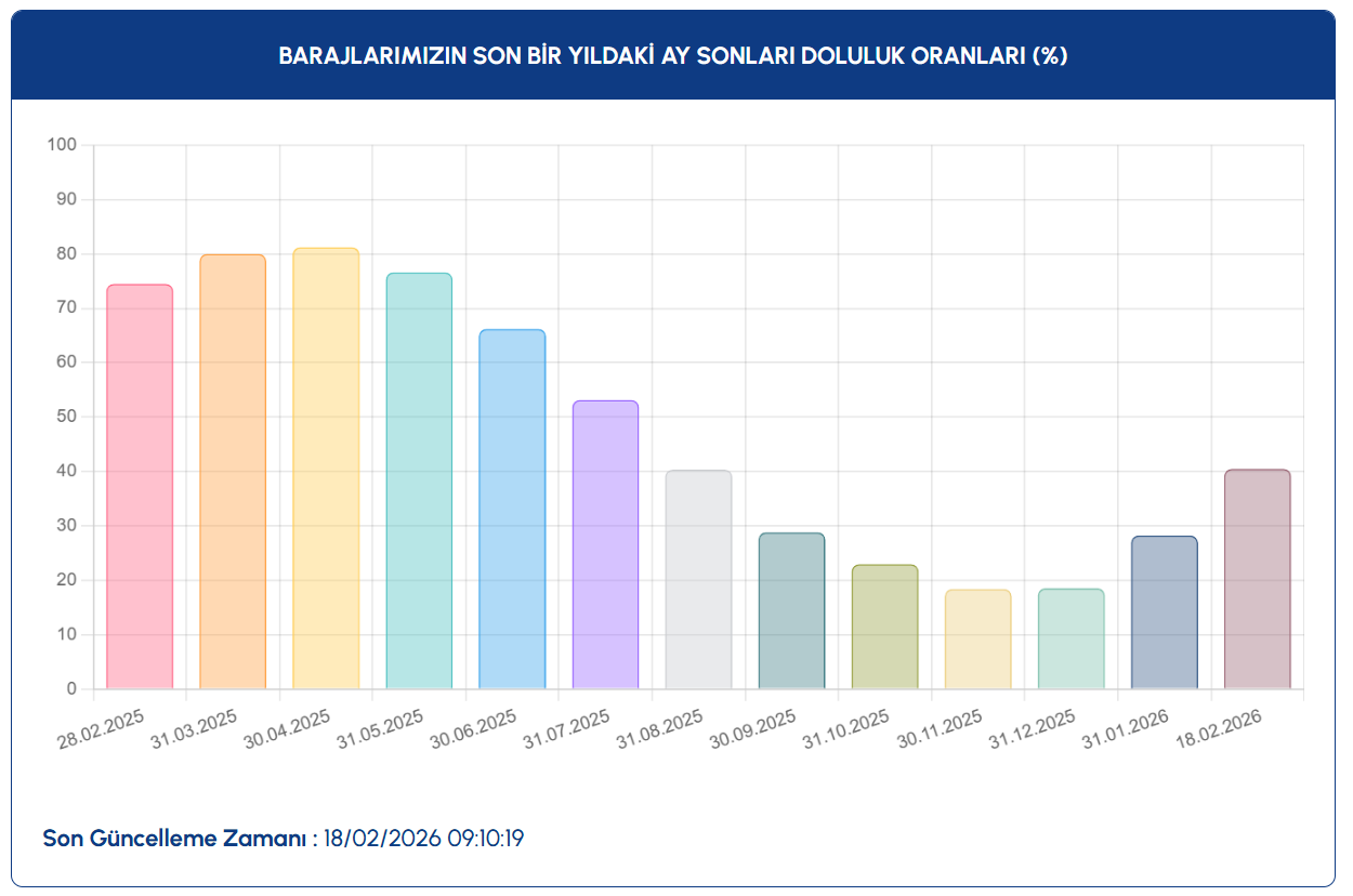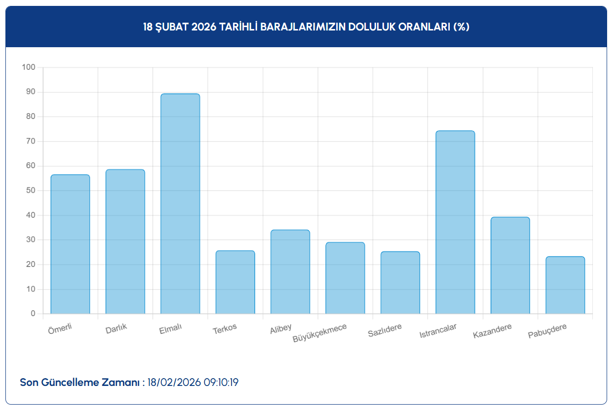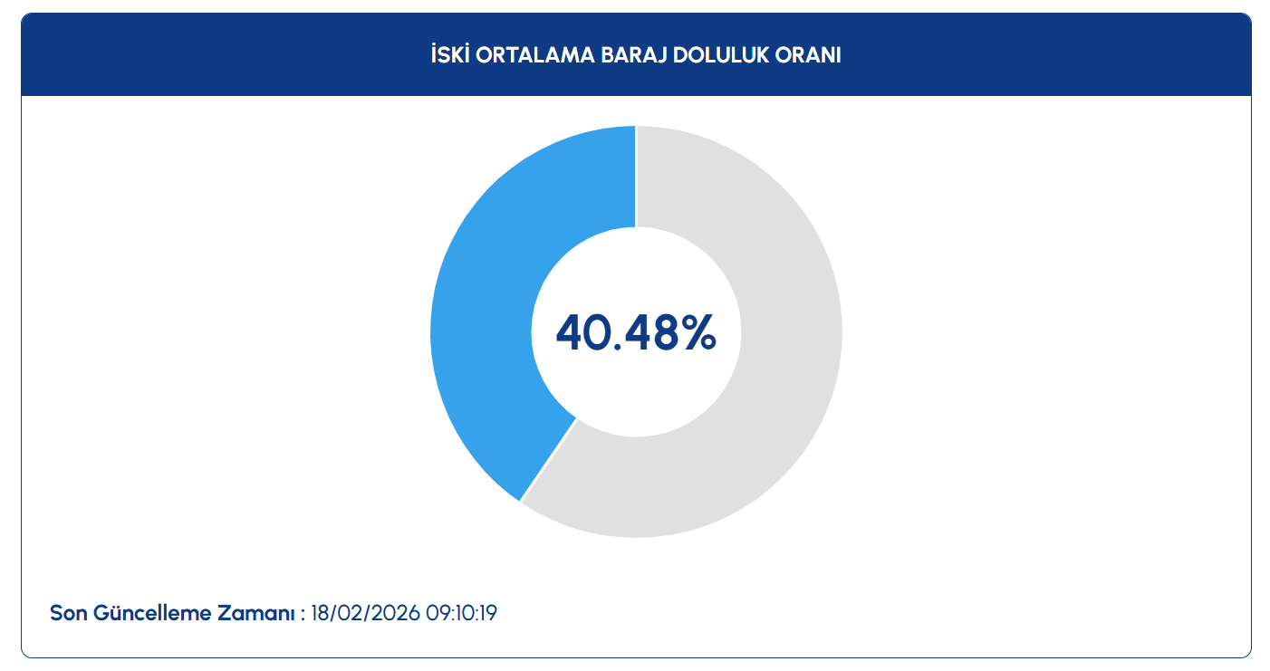 İSKİ istatistiklerine göre, 18 Şubat'taki baraj doluluk oranları 2016'da yüzde 86,74, 2017'de yüzde 85,65, 2018'de yüzde 79,51, 2019'da yüzde 91,59, 2020'de yüzde 61,8, 2021'de yüzde 48,67, 2022'de yüzde 80,25, 2023'te yüzde 33,94, 2024'te yüzde 75,56, 2025'te yüzde 66,01 ve 2026'da yüzde 40,48 olarak kaydedildi.
