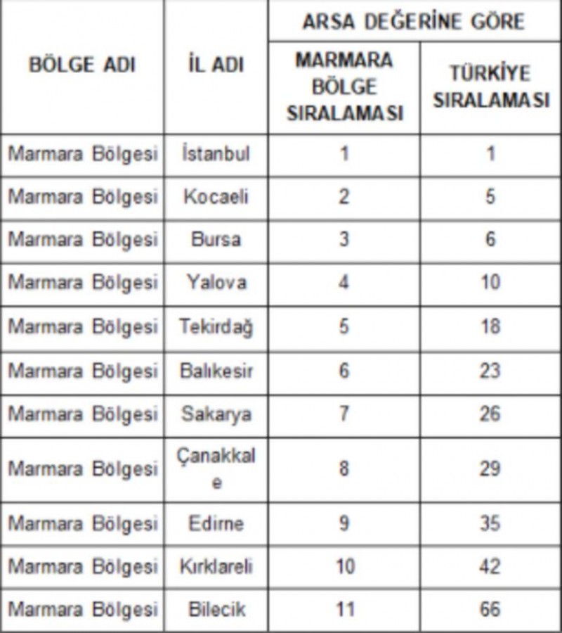 Hem Marmara Bölgesi'nde hem de Türkiye genelinde en değerli arsaların olduğu iller ile "Türkiye genelinde 81 ilin arsa değerlerine bakıldığında, ilk 10’da 4 Marmara Bölgesi ili karşımıza çıkıyor. Marmara Bölgesi, arsa değerleri incelendiğinde bölgesel olarak Türkiye'nin en pahalı arsa değerine sahip bölge olduğu görülmektedir. Bunda, her ne kadar en büyük etkiyi İstanbul sağlasa da, yine ülke genelinde ilk 10’a giren sırasıyla Kocaeli, Bursa ve Yalova gibi iller mevcut. Özellikle Çanakkale Köprüsü’nü 2022 yılında açılacak olması ve büyük montanlı kamu yatırımlarının stratejik önemi bulunan bu bölgeye kaydırılması nedeniyle Lapseki, Biga ve Karabiga bölgelerinde arazi satışları hızlı gerçekleşiyor" açıklamasında bulundu.