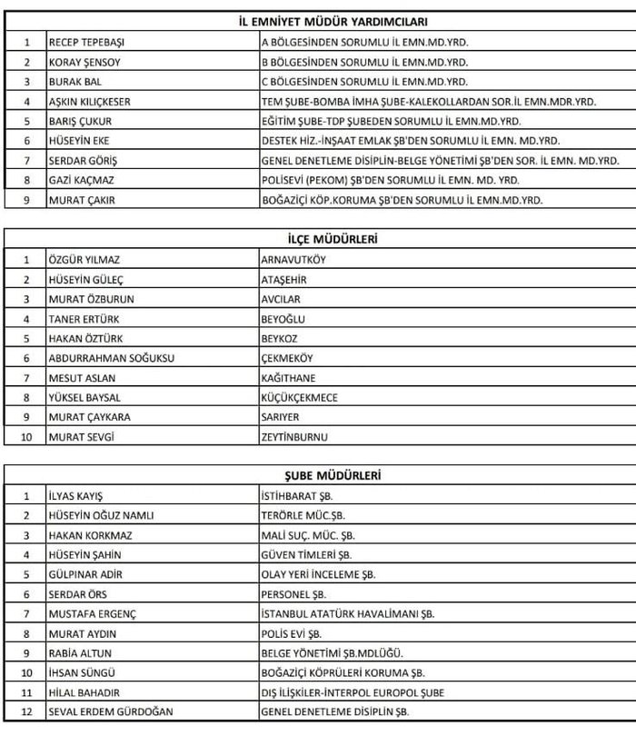 Bu isimlerin yanı sıra İstanbul'da görev yapan 21 emniyet müdürü ve emniyet amiri de farklı illerde görevlendirildi.