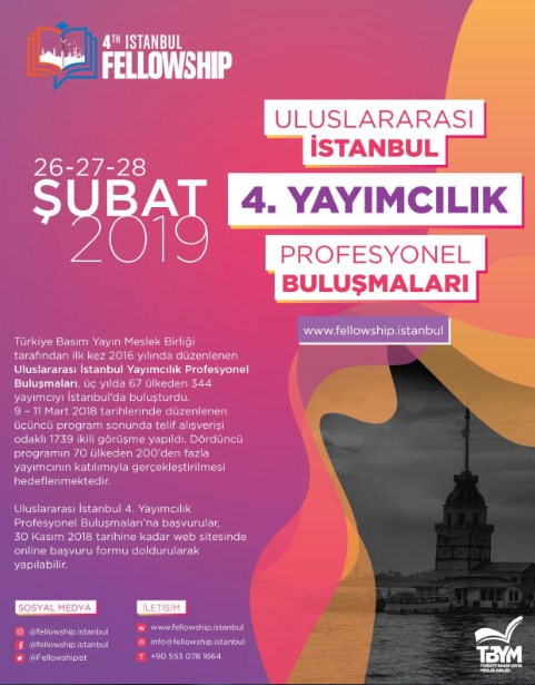Tüm dünyadan yayınevi yöneticileri, editörler, telif ajansları, yayımcı meslek birlikleri ve yayımcı sivil toplum kuruluşu temsilcilerinin buluşacağı İstanbul Fellowship (Uluslararası Telif Zirvesi) 26-27-28 Şubat 2019 tarihlerinde Avrasya Gösteri ve Sanat Merkezi'nde düzenlenecek.