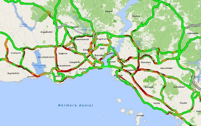 İBB Trafik Yoğunluk Haritasına göre kentte trafik yoğunluğu saat 08.30 itibariyle yüzde 66 olarak belirtildi.