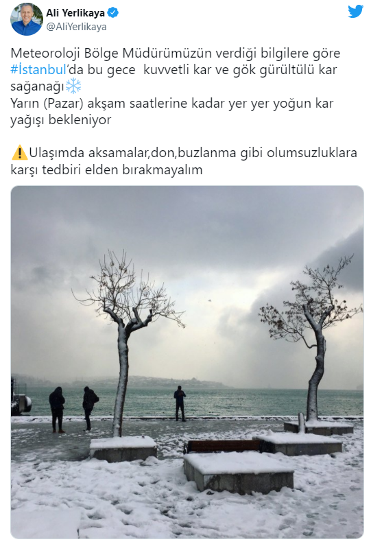 Yerlikaya paylaşımında, “Meteoroloji Bölge Müdürümüzün verdiği bilgilere göre İstanbul’da bu gece kuvvetli kar ve gök gürültülü kar sağanağı, yarın (Pazar) akşam saatlerine kadar yer yer yoğun kar yağışı bekleniyor. Ulaşımda aksamalar, don, buzlanma gibi olumsuzluklara karşı tedbiri elden bırakmayalım” ifadelerine yer verdi.