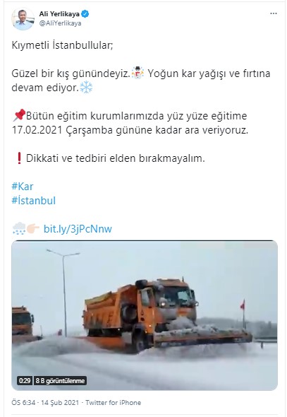 "Son aldığımız meteoroloji verilerine göre; hemşehrilerimizin ve öğrencilerimizin olumsuz hava koşulları sebebiyle mağduriyet yaşamaması için; resmi-özel tüm okullar, halk eğitim merkezleri, olgunlaşma enstitüleri, özel öğretim kursları, motorlu taşıt sürücü kursları, özel eğitim ve rehabilitasyon merkezlerimiz, resmi okullardaki destekleme ve yetiştirme kurslarımız ile özel okullardaki takviye kurslarımız da dahil olmak üzere bütün eğitim kurumlarında yüz yüze eğitim faaliyetlerine 17 Şubat Çarşamba gününe kadar ara verilmiştir.
