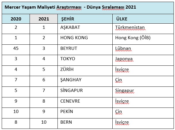 Her şehirde konut, ulaşım, yiyecek, giyim, ev eşyası ve eğlence dahil olmak üzere 200’den fazla kalemin karşılaştırmalı maliyetlerinin ölçüldüğü araştırma sonuçlarına göre, 2021 yılının en pahalı şehri Aşkabat, yaşam maliyeti en düşük şehir ise Bişkek oldu. Yıllardır dünyanın en pahalı şehri olan Hong Kong ikinci sıraya gerilerken, 2020 yılında Beyrut Limanı’nda gerçekleşen patlama ve Kovid-19 gibi nedenlerle meydana gelen geniş çaplı ekonomik buhran sonucunda 42 basamak birden yükselen Beyrut ise en pahalı üçüncü şehir olarak sıralandı. Tokyo 4’üncü, Zürih 5’inci sırayı paylaşırken, geçen yıla göre bir basamak yükselen Şangay 6’ıncı sırada yer aldı. Araştırmaya göre; Singapur 7’inci, Cenevre 8’inci, Pekin 9’uncu ve Bern 10’uncu ise sırada. Uluslararası çalışanlar için dünyanın en ucuz şehri ise 209’uncu sırada yer alan Bişkek oldu. 207’inci sırada yer alan Tiflis ve 208’inci sıradaki Lusaka diğer ucuz şehirler olarak sıralandı. Geçtiğimiz yıl aynı araştırmada 156’ıncı sırada yer alan İstanbul ise, kurdaki değişimin de etkisi ile bu yıl 17 sıra gerileyerek 173’üncü sıraya yerleşti.