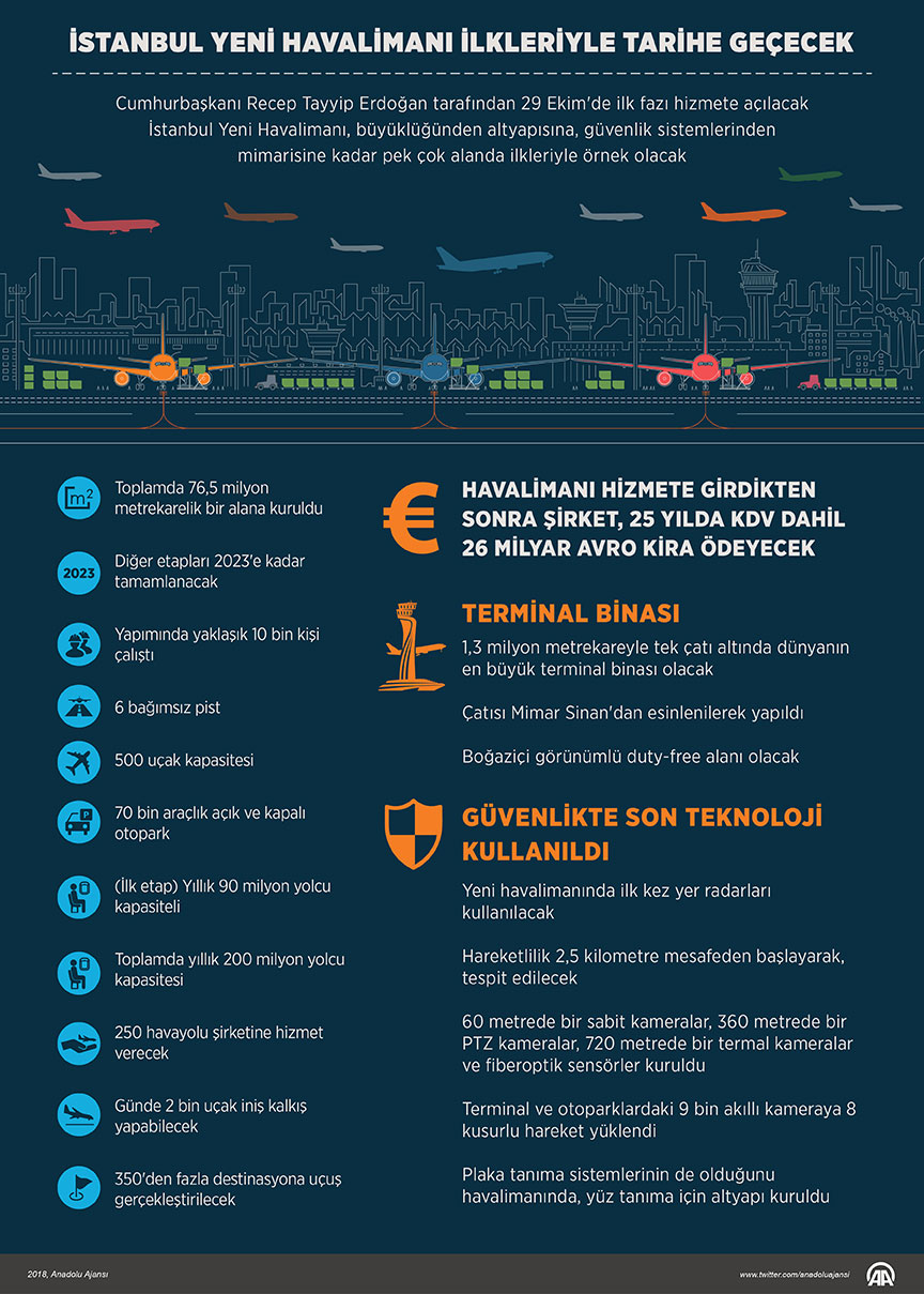 Cumhurbaşkanı Erdoğan tarafından 29 Ekim'de ilk fazı hizmete alınacak İstanbul Yeni Havalimanı böylece büyüklüğünden altyapısına, güvenlik sistemlerinden mimarisine kadar pek çok alanda dünyaya örnek olacak.